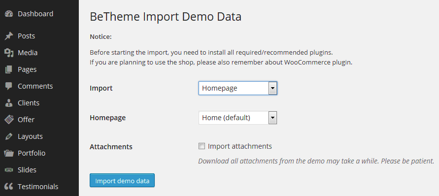 Since version 2.4 we added 1 Click Demo Install possibility for better purposes. If you are using this option you don`t need to use .xml files no longer. All you need to do is go to Appearance > BeTheme Demo Data section and choose what exactly you want to install. You can select if you want to install whole content, one of homepages, content, options or widgets.