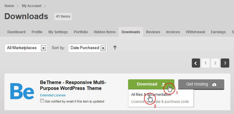 At first, after purchasing this theme please download the package from Themeforest. All you need to do that, is move your mouse over your login name in right top corner (of course after you`re logged in Themeforest) and then click Download. Here you will find all the items that you have purchased. It looks exactly just as the diagram next to.