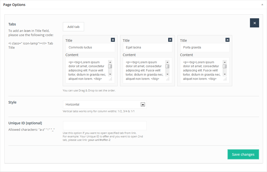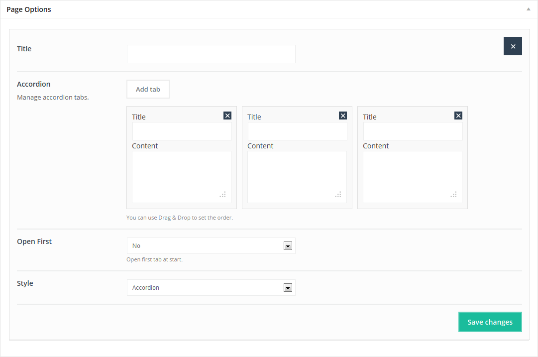 This Item is adding Accordion or Toggle on page. You can add as many tabs as you need, just type Title and Content (you can use html tags) for each tab. You can also use Drag&Drop option to set the order for items.