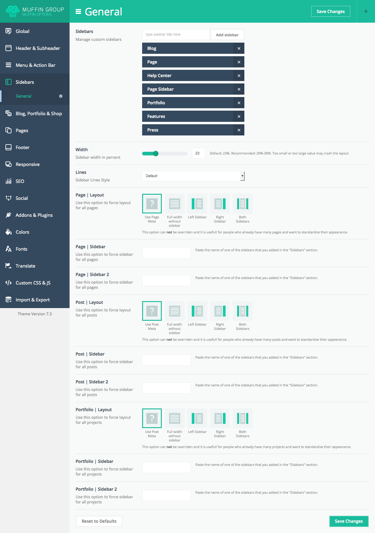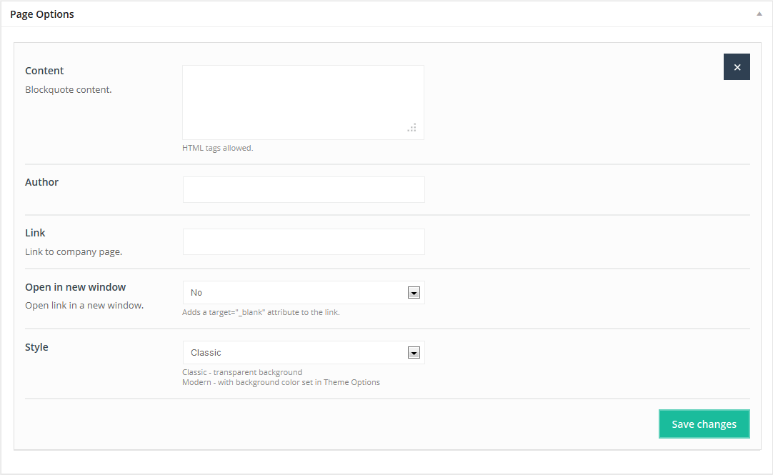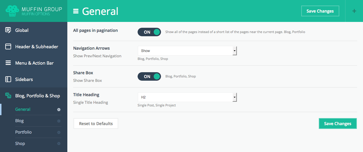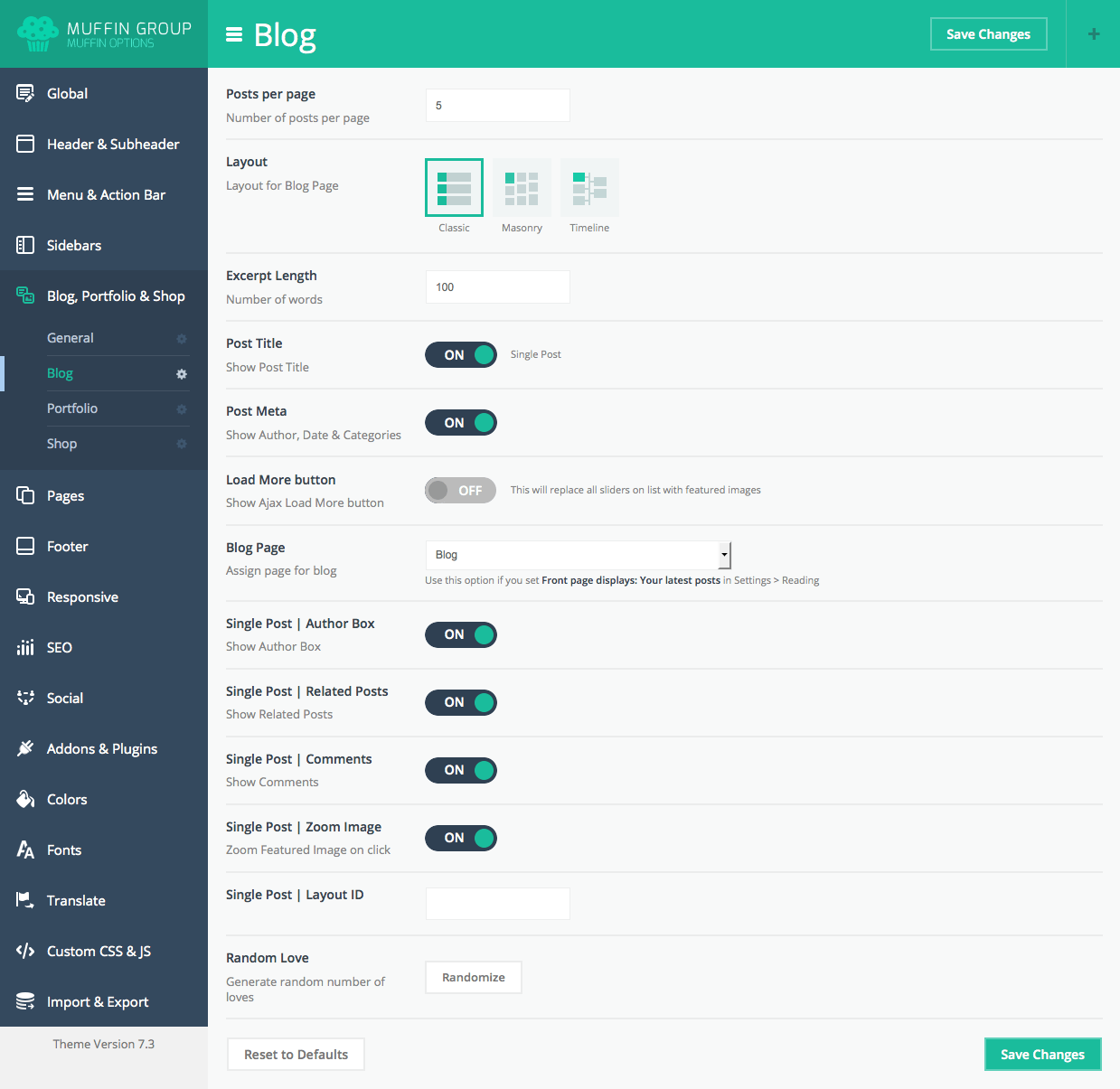 We have created some features specifically for bloggers. You will find them in Theme options panel > Blog, Portfolio & Shop > Blog. These options are set on default for each new post. Full description of options for blog can be found in section Theme Options