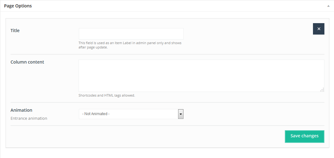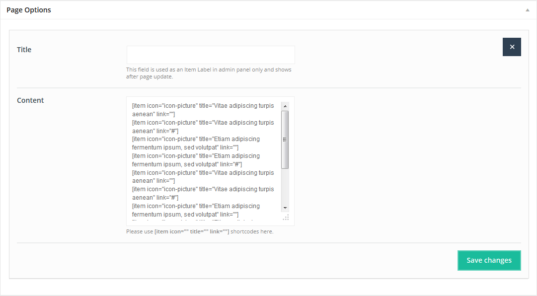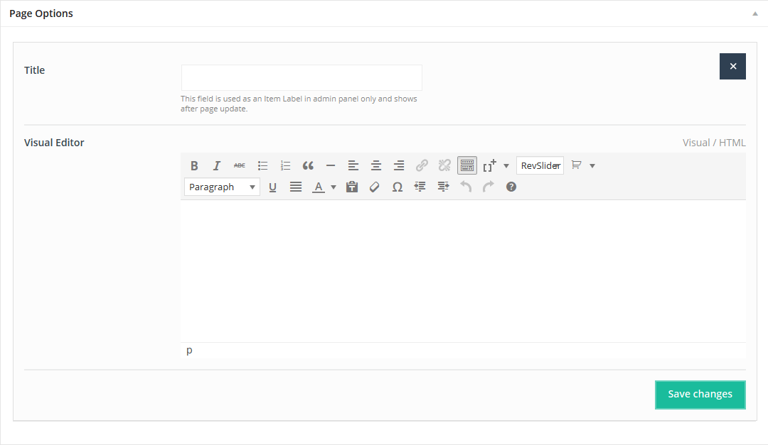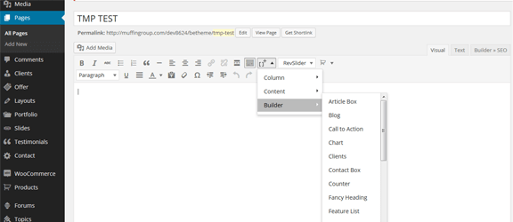 In first Visual/HTML area you can build your page using all available options in editor. Beyond the default options we included []+ button for WordPress editor. With this option you can build any page you want based on shortcodes. All available shortcodes for this theme has been described in Muffin Builder & Shortcodes section.