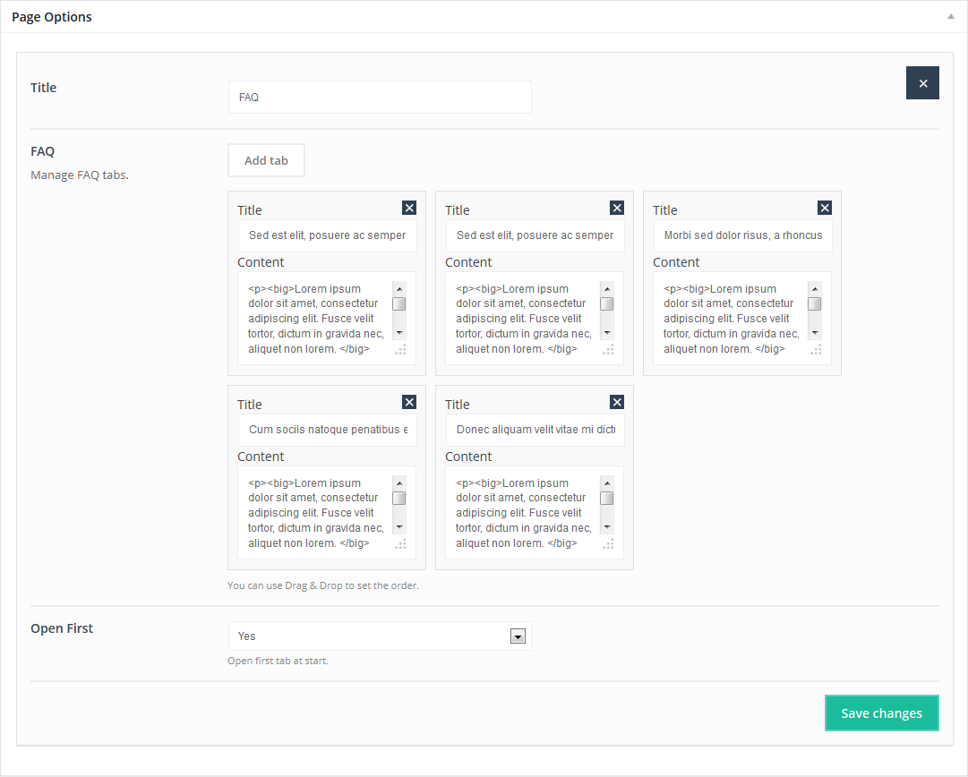 With this item you can create own FAQ page. You can also use Drag&Drop option to set the order for items.