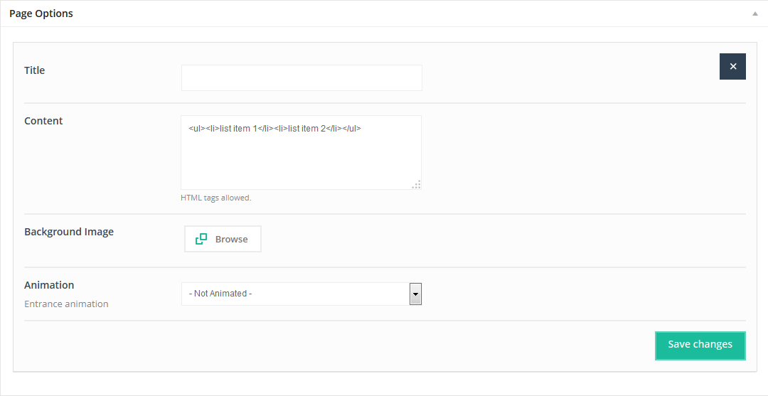 Creating your own page has been never so easy. To make the first step please go to Pages > Add new. On first sight everything looks just like in default wordpress. But when you have a look under Visual/HTML area you will see some Page options.
