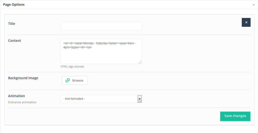 This item will create nice Opening hours box where you can type any content you want inside. Also you can setup background image to make this item much nicer.