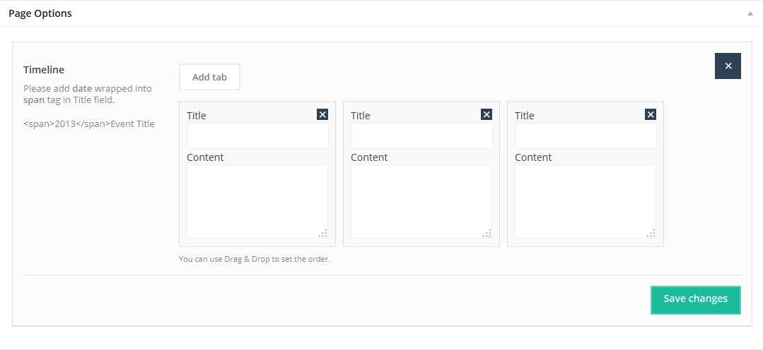 This Item will create Timline section and you can use it for anything you need. Inside it works just like Tabs or Accordion. Just Add tab and add any content you want inside.