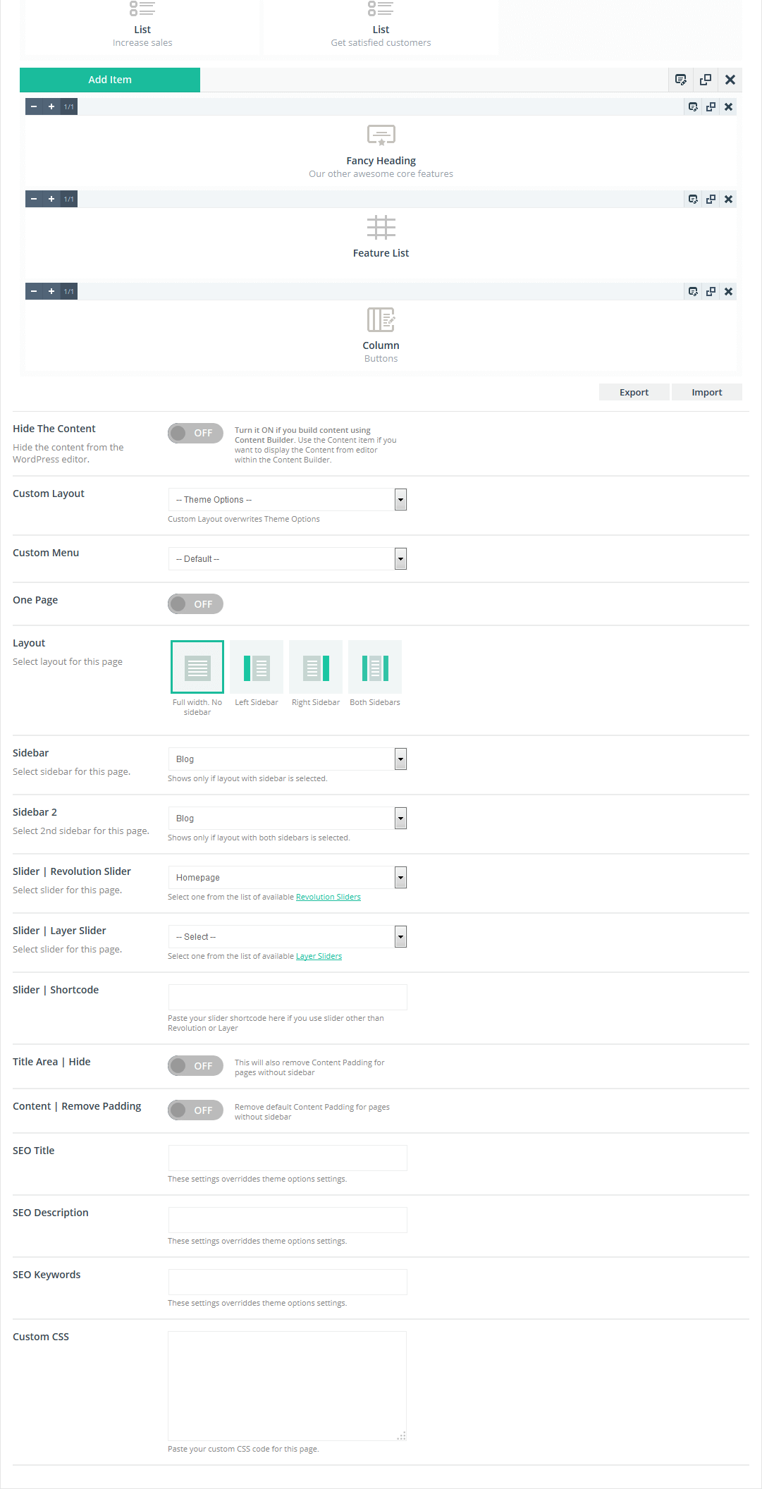 This is totally new item which gives you lot`s of possibilities with creating pages. Now you can split each page, post or portfolio item for sections. Section is a part of page and can have own settings. Please take a look on image next to.