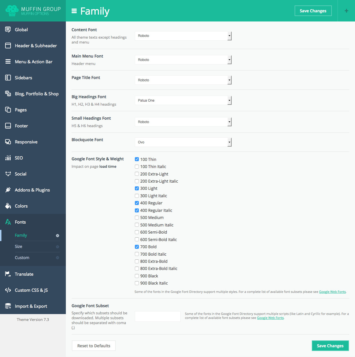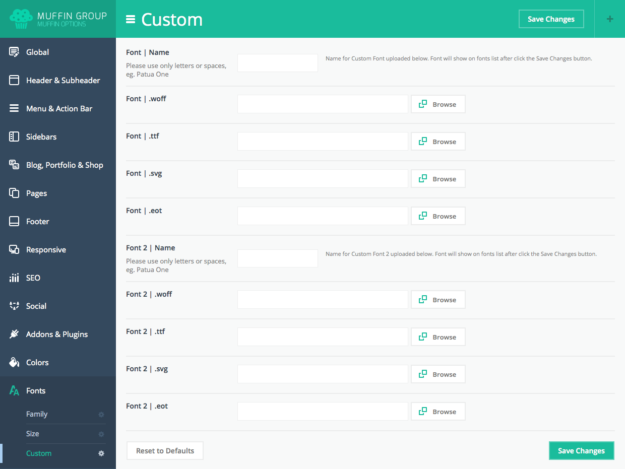 IMPORTANT!!! We added fields for custom fonts. If you have own font and don`t want to use any of Google Fonts, you can upload own files for this font and use it inside theme. Each font consists from 4 files: .woff, .ttf, .svg and .eot and all those files must be uploaded in right fields. Only then your font will work properly. After upload you can select custom font for right sections.