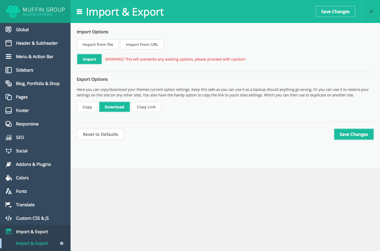 This section is especially for all those who want to move settings from theme options panel between themes or when you move your website from test server to live. You have few different ways to import or export settings what you can see on image next to.
