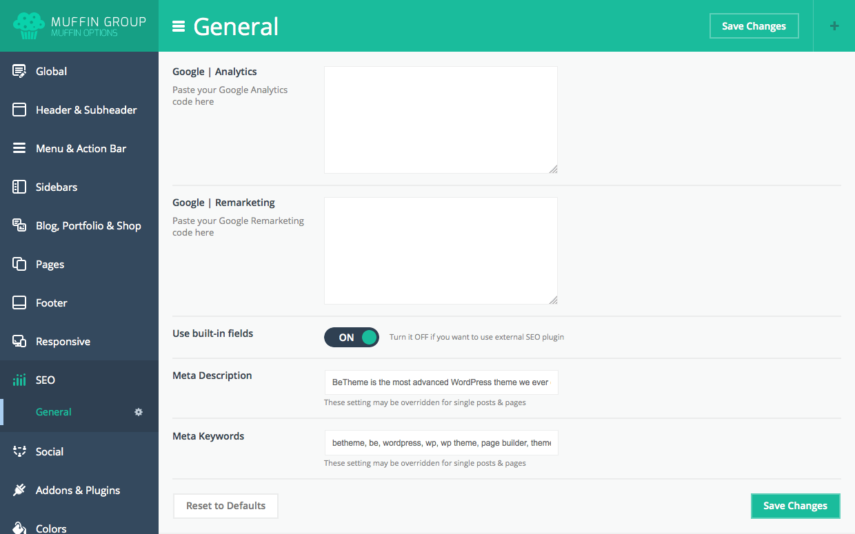 To set up general options for SEO please go to BeTheme options > SEO . You can set up here things like Meta Description or Meta Keywords for homepage (this is also default option for each new page).