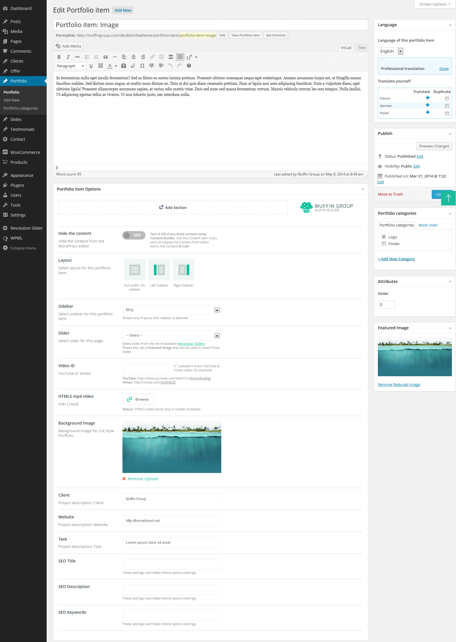 With Be|theme, we added many new options for Portfolio. Now, whole content inside portfolio item can be created with Muffin Builder (of course you can use wp default editor as well if you want). It works the same way as for standard pages. Under Muffin Builder you can also find more options like SEO fields, slider, sidebars and many other. All available options for Portfolio item you can see on the right side image.