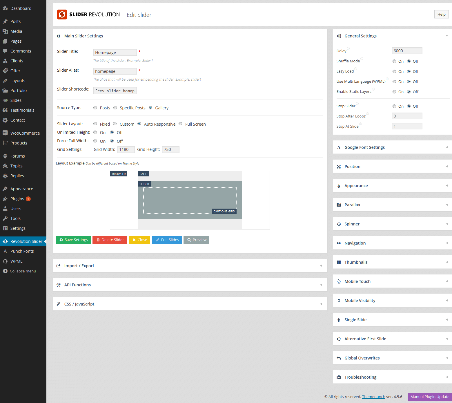 If you don`t want to use Revolution Slider and need something simplier then we recommend to use Slider item. You can show some images on simple slides in easy way. This item only give you possibility to paste slides on page. If you want to add slides then, you should do it in "Slides" section which is available on the left side in wp dashboard where is whole menu.