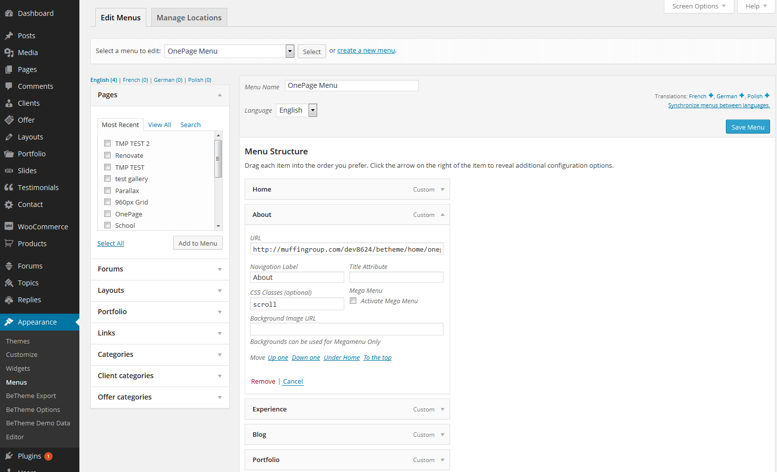 Menu creation works as in default Wordpress.