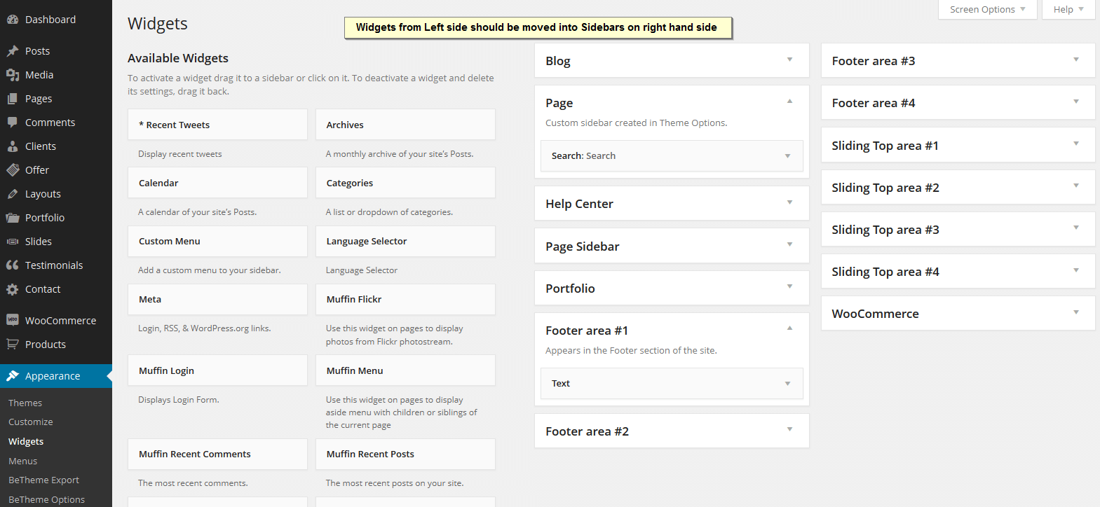 We included 9 custom widgets but in total you have 33 different widgets to use. To get them, all you need to do is drag widgets available on left side and drop into right sidebars on the right side. But if you want to create own sidebar, then please navigate to Appearance > BeTheme Options > Sidebars section and create as many sidebars as you need because this is unlimited. After that, you can go back to Appearance > Widgets section and move widgets again into new sidebars.