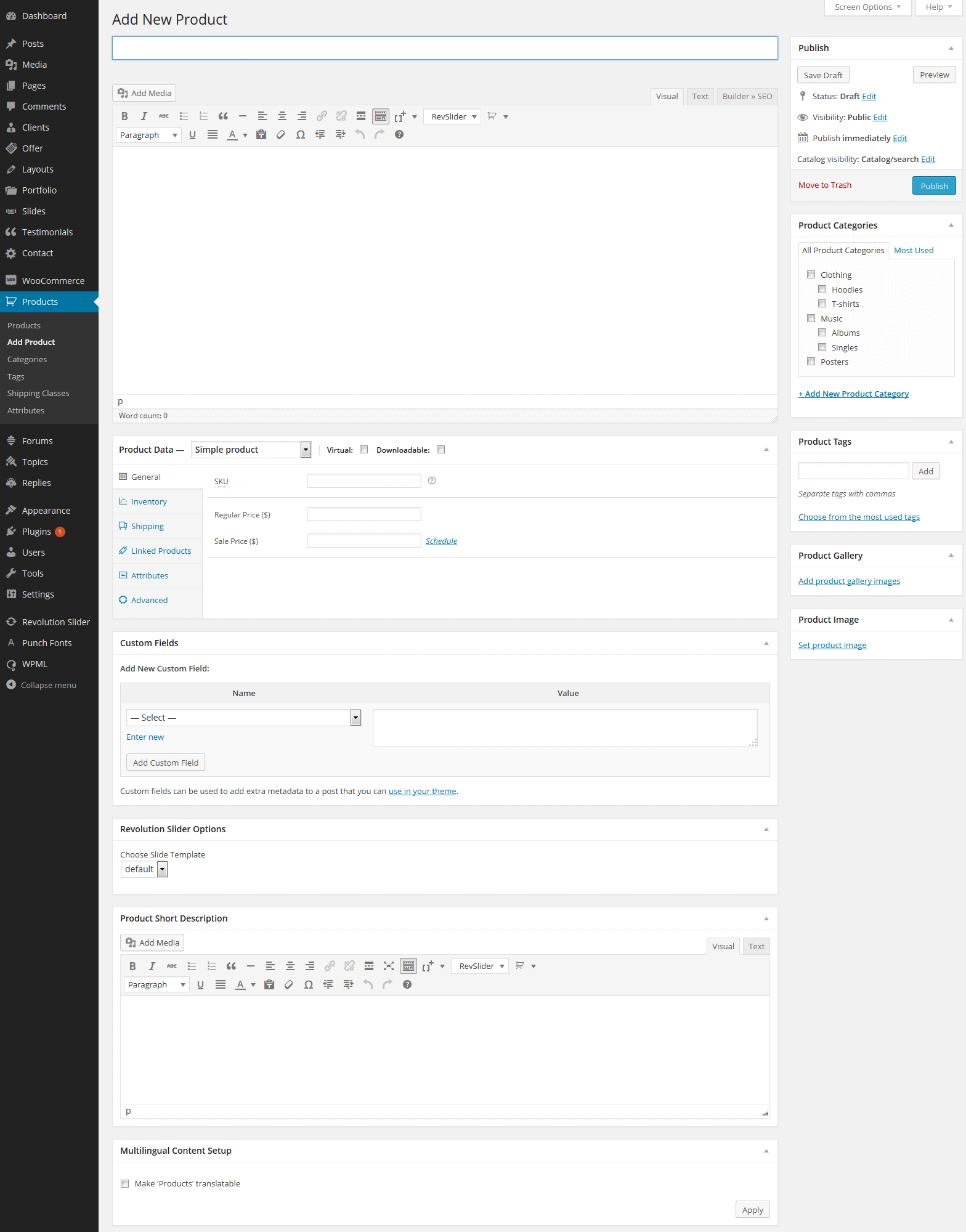 Go to Products > Add product section. After that you will see page wich looks like below and all you need to do is fill those fields with own values.