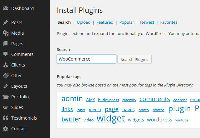 At first please go to Plugins > Add new section and type "WooCommerce" into search field. Then click "Search Plugins" button.