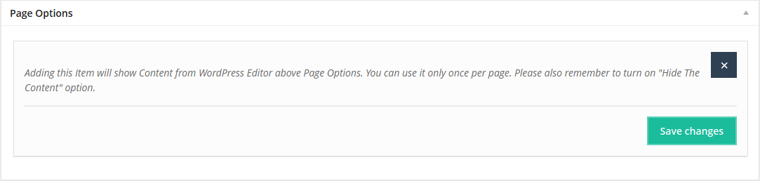 Adding this item will show Content from Wordpress Editor above Page Options section. You can use it only once time per page. Please also remember to turn off "Show The Content" option if you prefer using this item as in other case, content will be duplicated.