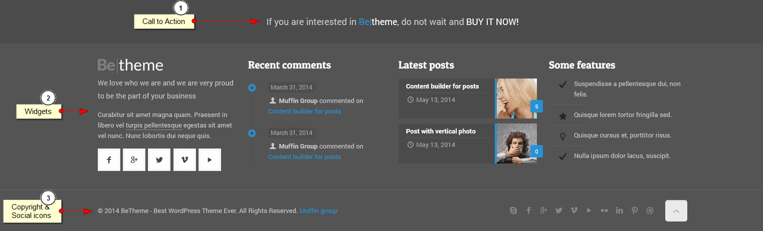 Footer was divided into 3 different sections: Call to action, Widgets and Copyright & Social icons. One screenshot below you will see explanation of what is what: