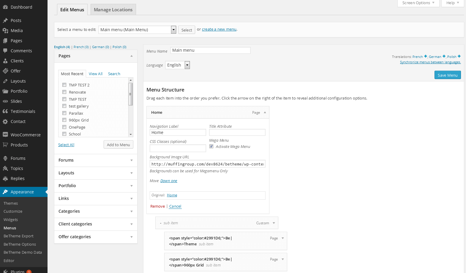 Menu creation works as in default Wordpress.