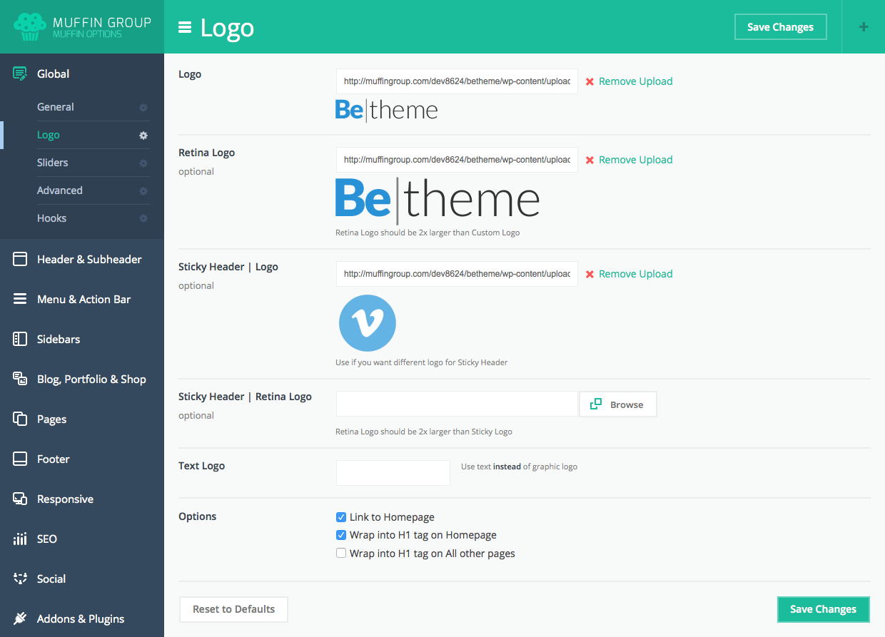 To setup logos please navigate to Appearance > BeTheme Options > Global > Logo section and you will be able to upload Custom, Retina & Sticky Header Logos. Under you can also setup some different logo options. Please remember that Retina Logo should be always 2x larger than Custom Logo (this field is optional).