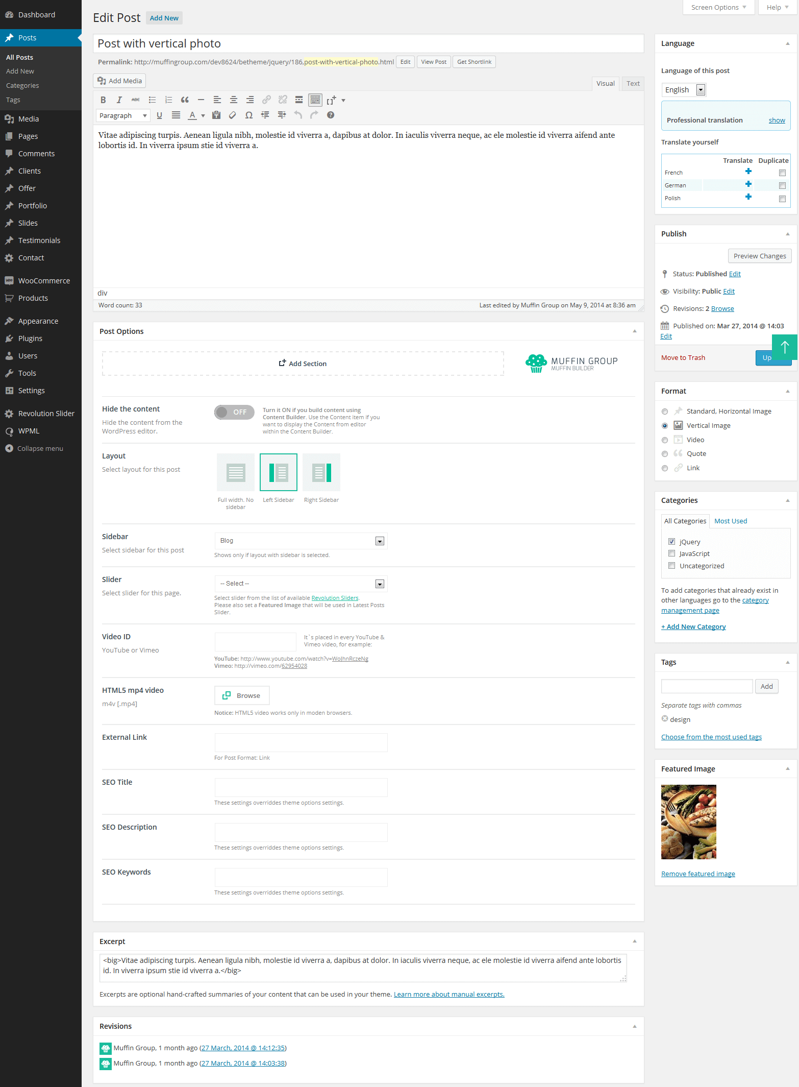 With Be|theme, we added many new options for Portfolio. Now, whole content inside portfolio item can be created with Muffin Builder (of course you can use wp default editor as well if you want). It works the same way as for standard pages. Under Muffin Builder you can also find more options like SEO fields, slider, sidebars and many other. All available options for Portfolio item you can see on the right side image.